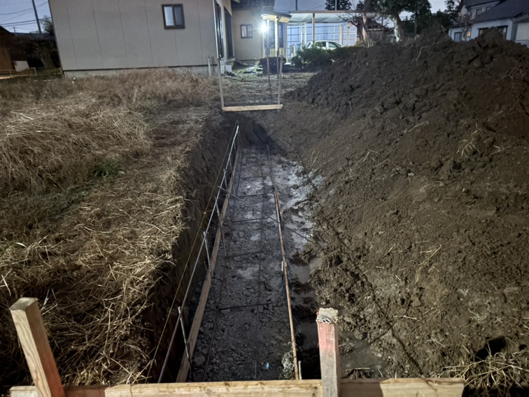 遣り方出し、掘削、転圧作業と鉄筋を組んでいきます。