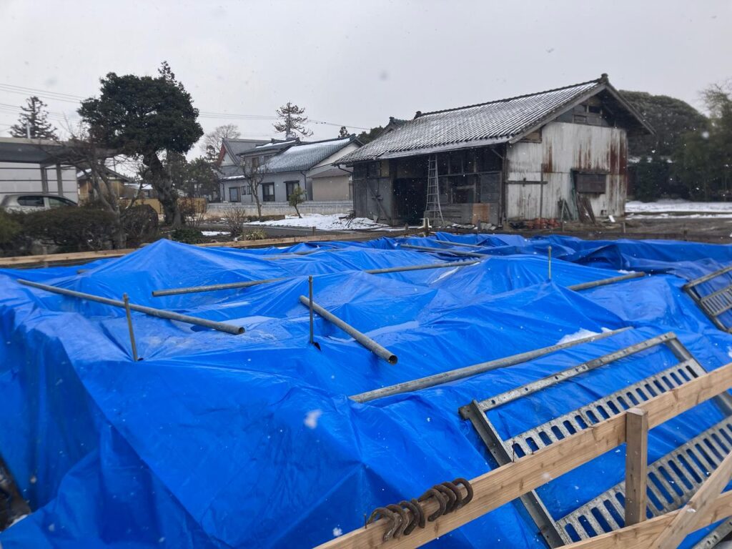 養生として全面にブルーシートをかけることに。