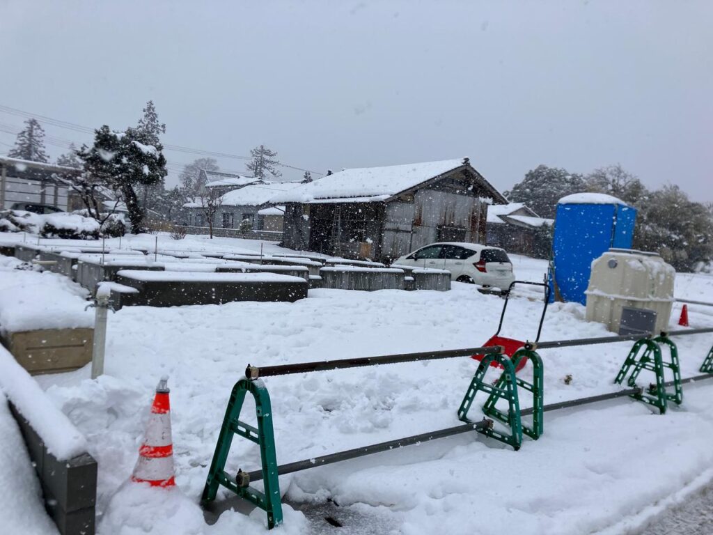 現場内の駐車スペースも積もりました。
