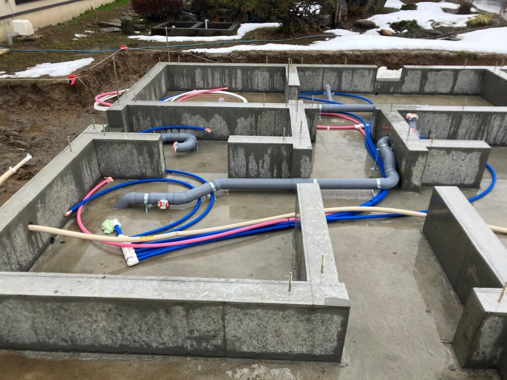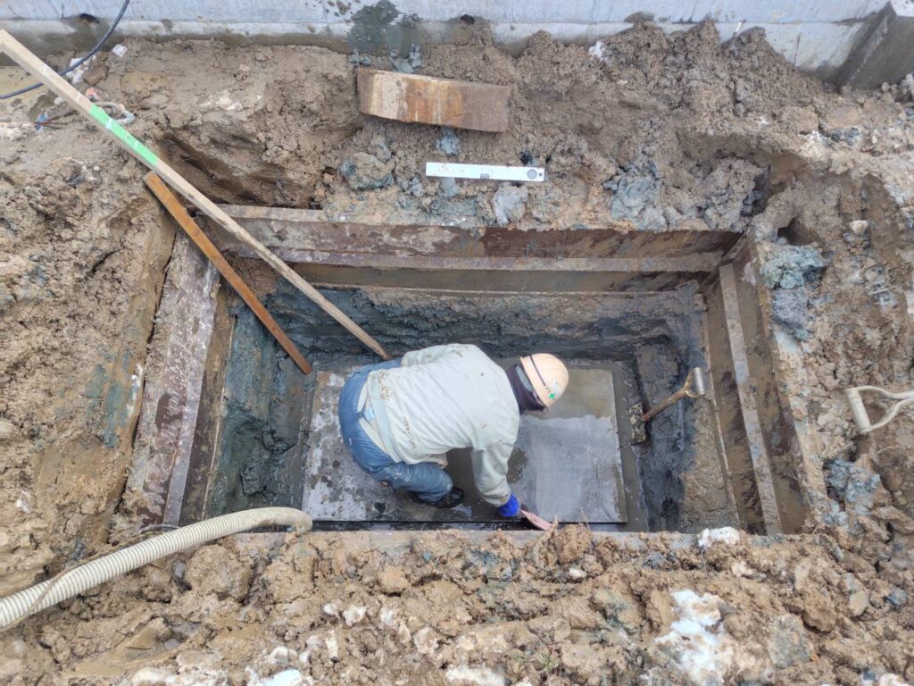 穴の底には浄化槽が沈まないようにコンクリートベースを打設しています。